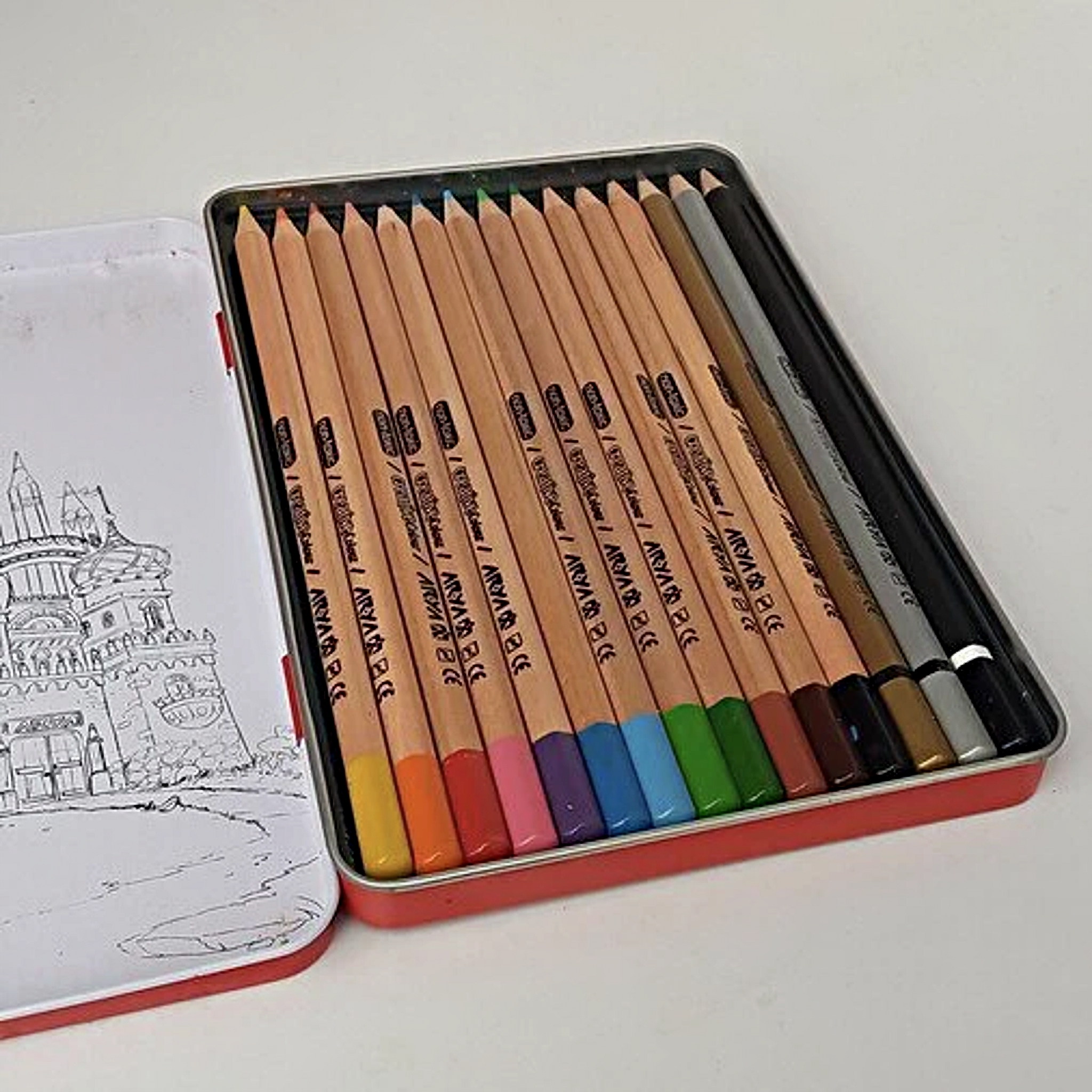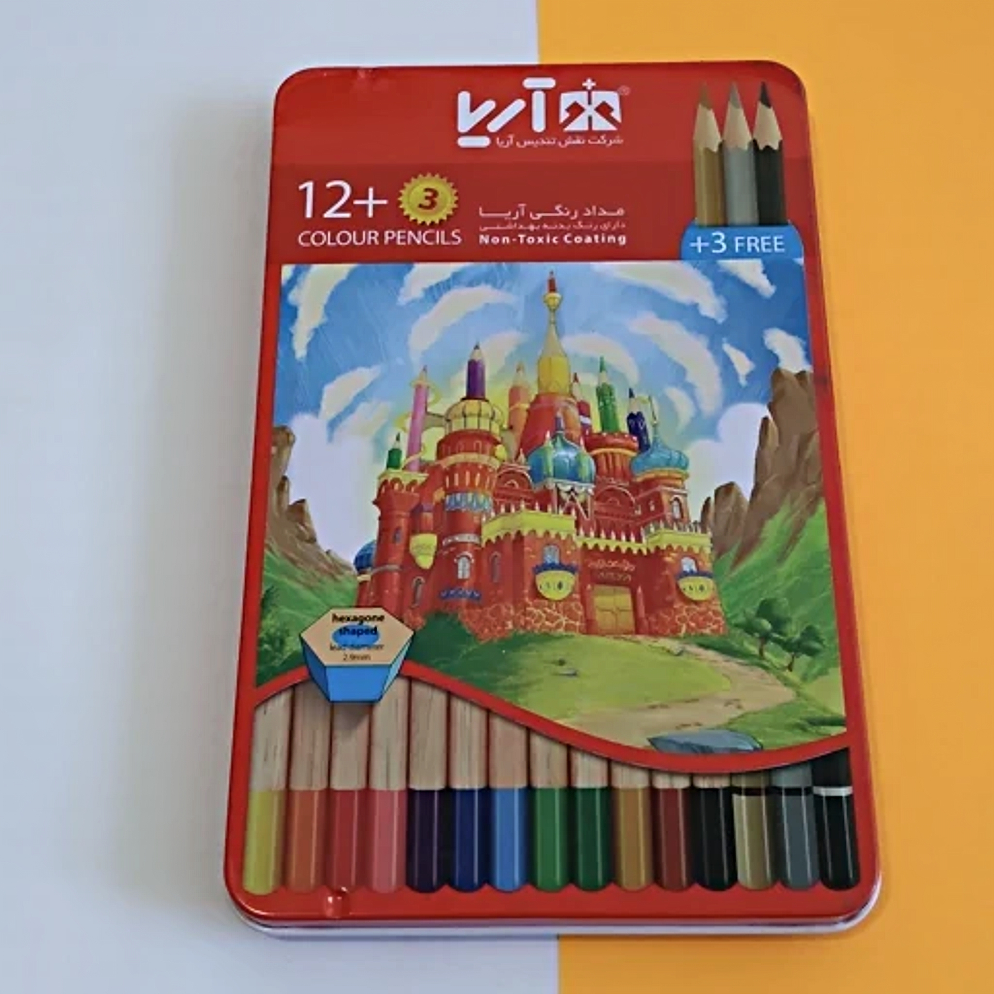 مداد رنگی ۳+۱۲ رنگ آریا جعبه فلزی طرح قلعه